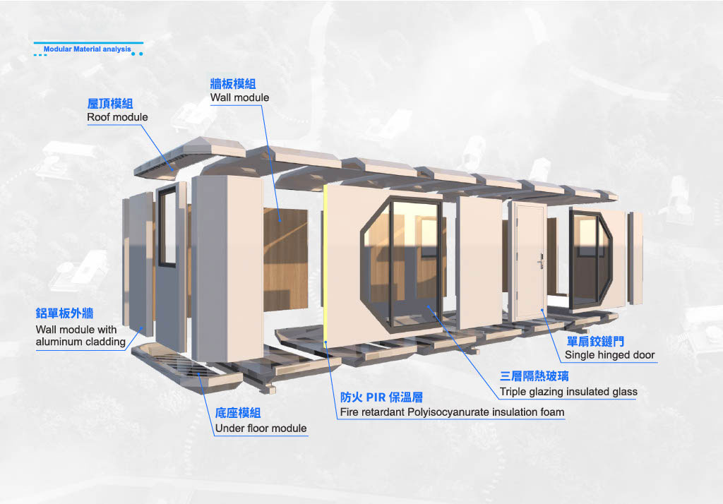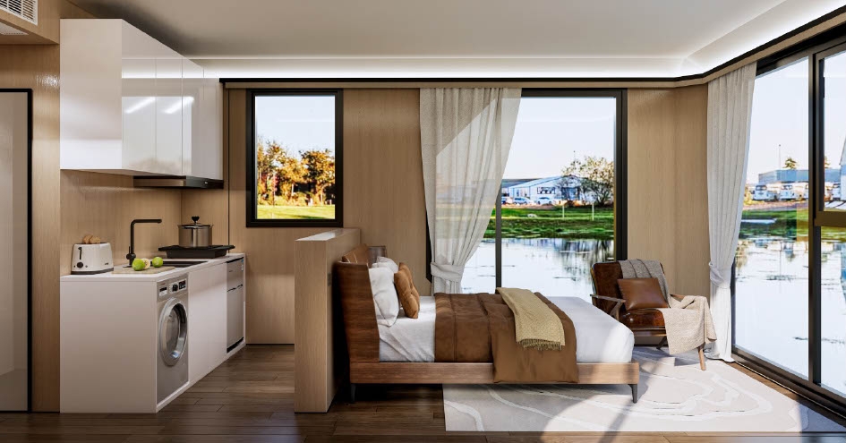 屋內具備完整生活機能,包括客廳、廚房、臥室與獨立衛浴,讓小空間也能享有舒適與便利。無論你想打造旅居生活、後院 ADU、出租空間、店鋪工作室,甚至戶外營區住宿,此款模組化 ADU 都具備高度機動性與擴充彈性,是現代多功能居住房屋的新選擇。